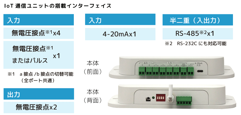 無電圧接点、パルス、4-20mA、RS-485搭載
