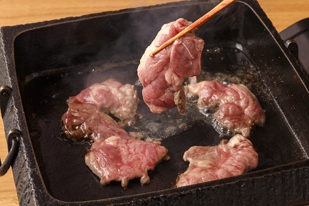 「すき焼き」の前に、新鮮なラム肉本来の美味しさを味わっていただくために、軽く熱を通す「焼肉」をお楽しみいただきます。ジンギスカンの代表的な部位としても知られる「肩ロース」や、風味豊かで柔らかい赤身の「ランプ」をサッと焼いて、りんごと玉ねぎをたっぷり使った特製のおろしダレにくぐらせれば、 さっぱりと、且つジューシーなラム肉の旨みを堪能できます。