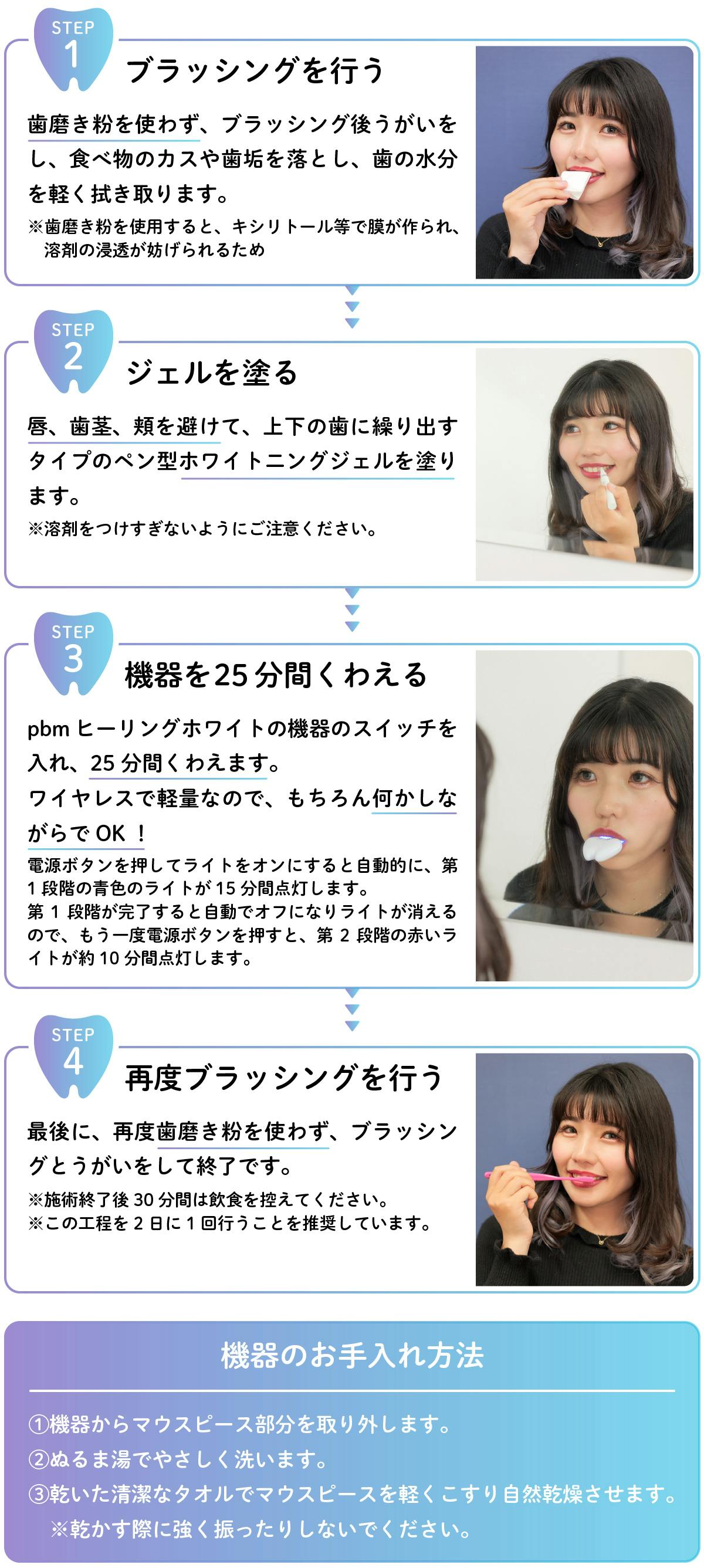 この「pbmヒーリングホワイト」は、2日に1回、歯にジェルを塗布して、25分間、ワイヤレスで軽量の本体をくわえるのみでホワイトニングができます。