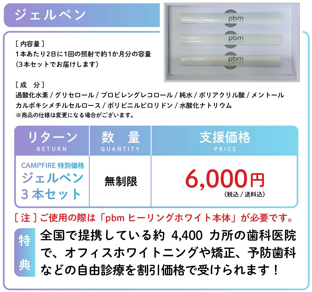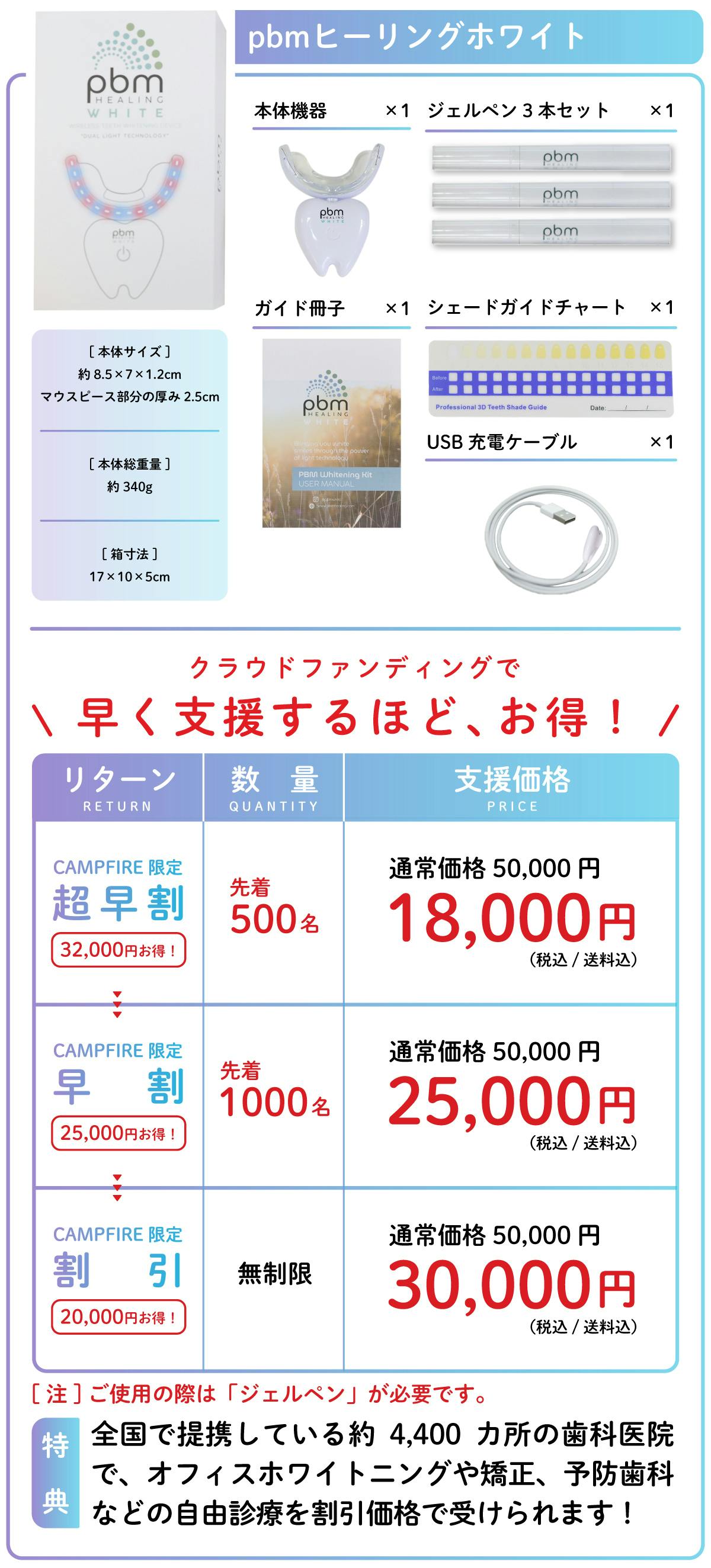 pbmヒーリングホワイトの各製品の仕様と、CAMPFIRE限定でお得な価格でご提供いたします!早割はどれも限定数があります。ホームホワイトニングが気になっていた方は、ぜひこの機会にお早めにお試しください!