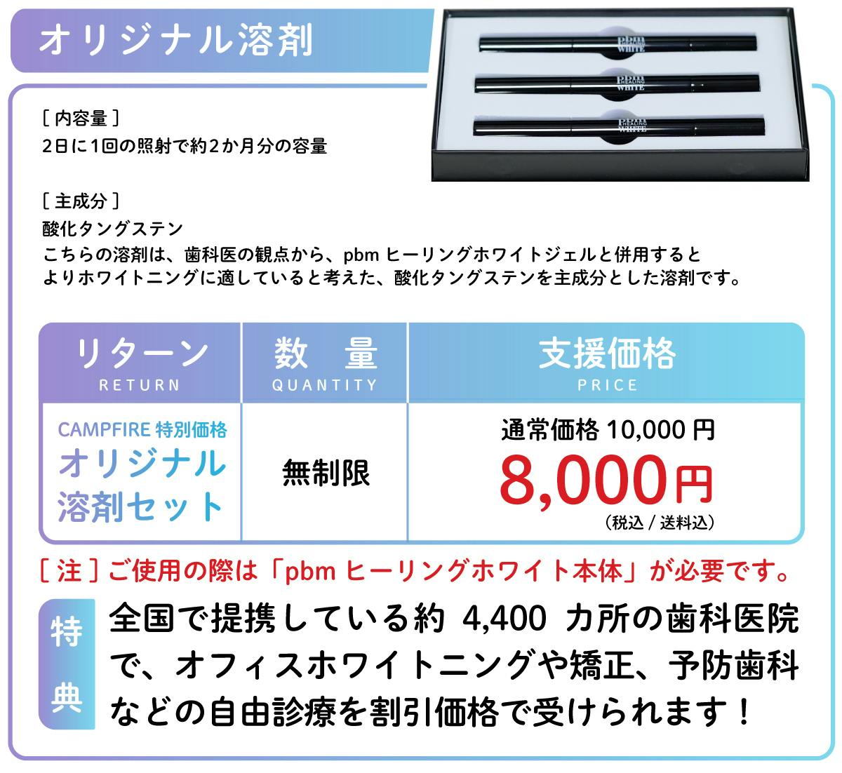 今回のプロジェクト立ち上げにあたりまして、pbmヒーリングホワイトジェルと交互で使うとより口腔内に優しく、効果も高まる、オリジナル溶剤を共同開発いたしました。こちらも、このクラウドファンディングのリターンとして提供します。