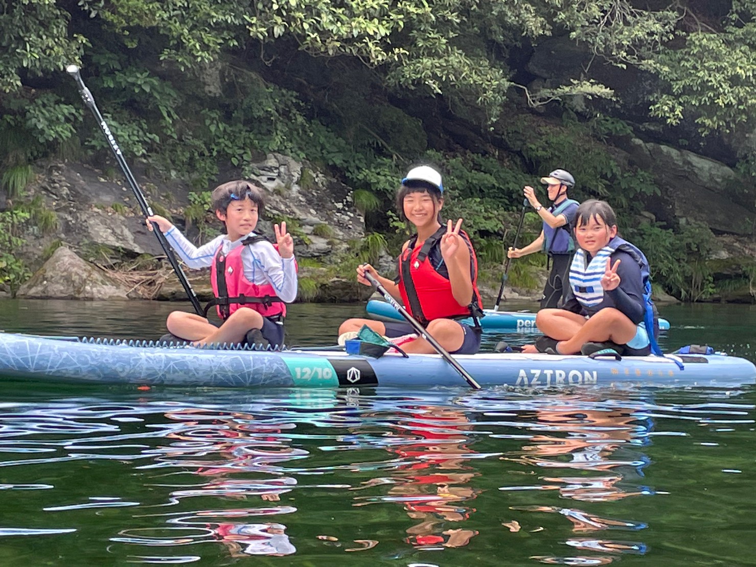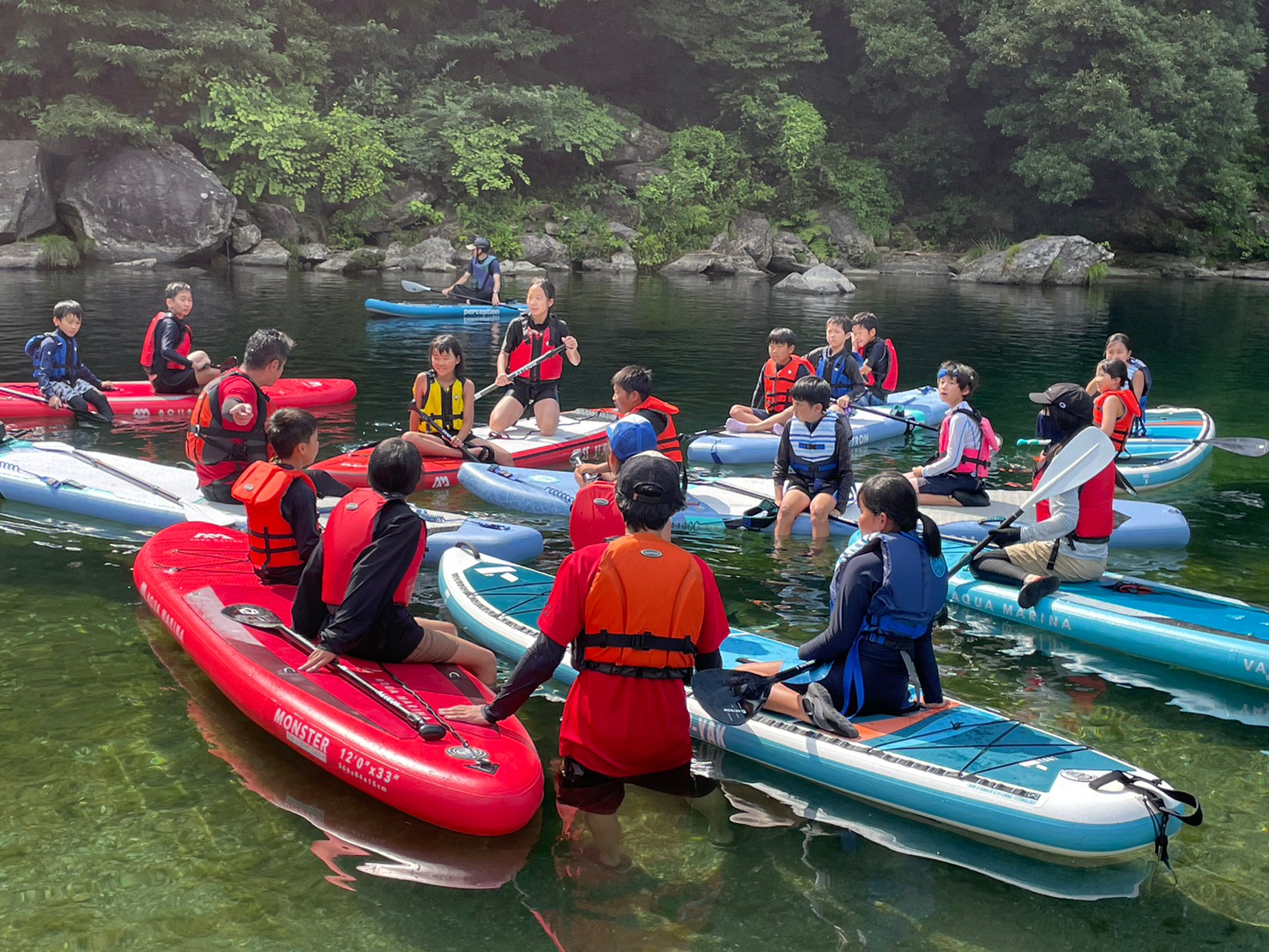 下山した後は、石鎚山系に源流がある加茂川中流域でSUP体験を行いました。西条アウトドアサービス インストラクターの上田公彦さんを講師に迎え、それぞれの川の水温や透明度、川に生息する生物を観察しながら、森の栄養分を海に届ける川の役割について理解を深めました。子供たちは初心者とは思えないほど上達が早く、10分もするとしっかり乗りこなしていました。水面をスイスイ進むSUPに子どもたちからは満足そうな笑顔が見られました。