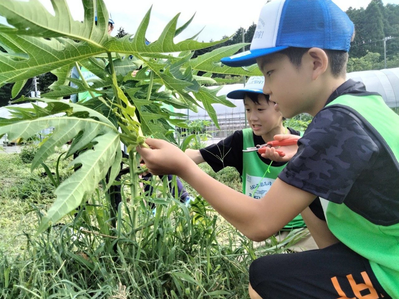 西条農業高校食農科学課の生徒さんを講師に迎え、石鎚山系の中腹、加茂川の中流域の耕作放棄地を利用した農園で、里山の機能について学びました。青パパイヤの生育には加茂川の河川水を活用しており、子どもたちは青パパイヤの葉を摘み、パパイヤ茶を試飲しました。パパイヤの葉は苦く、「葉は苦いけど、お茶にすると美味しい!」と、鳥獣害・害虫を寄せ付けないという特徴を体感し、農業と自然環境との共生について考えました。