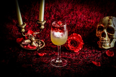 闇に支配された館の中で光を放つことができるのは、伯爵がその力を与えたもののみ。この乾杯酒もその一つ。怪しく美しく明滅するグラスにはアップル&ピーチの甘酸っぱいノンアルコールカクテルが。そこに、血の色の如き赤ワインor血の名を冠するブラッドオレンジジュースを注げば開宴準備完了。