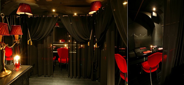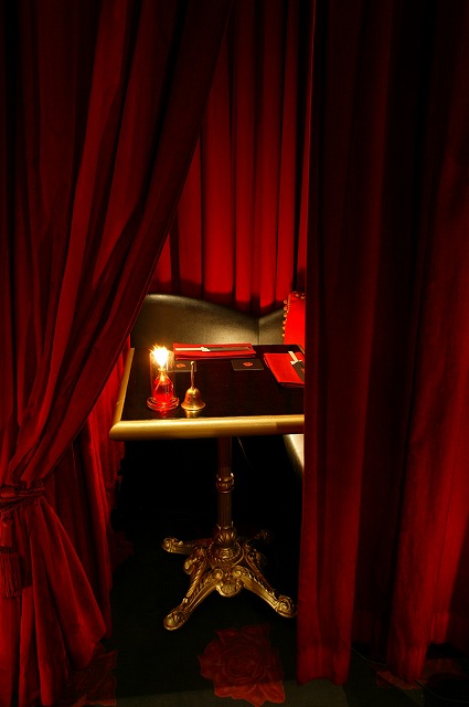 紅く厚いベルベットカーテンで仕切られたL字型のシート。