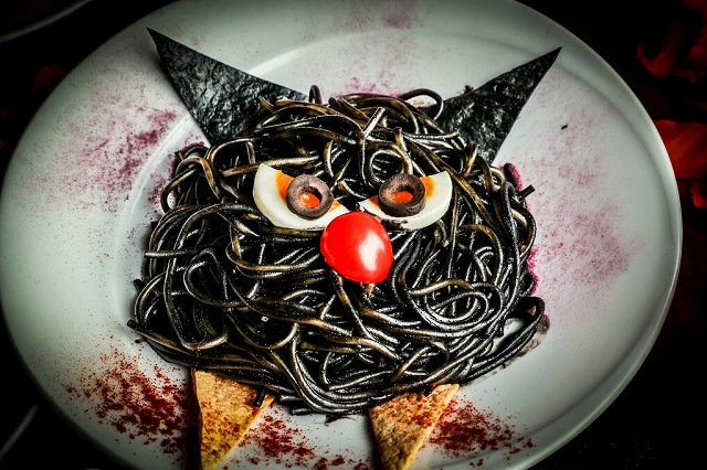 愛嬌たっぷりの可愛らしさで、館のアイドルとして活躍する黒猫ちゃんがモチーフ。ハロウィンの仮装でいつもよりちょっとおどろおどろしい見た目ですが、イカスミのコクと濃厚でまろやかなクリームが混ざり合った館秘伝の漆黒のソースを纏いし美味なるパスタ。スモークサーモンの塩気との相性も抜群です。