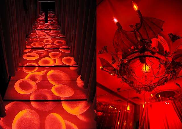 「魔除の十字架」が埋め込まれたフロントスペースに迎えられ進んでいくと、紅いベルベットのカーテンに取り囲まれ、赤血球が浮かび上がる廊下が伸びています。通り抜けた先に棺桶が中央に鎮座する広間が出現…!