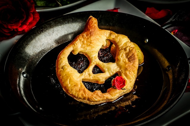 館の主のモチーフである薔薇をくわえて、不敵な笑みを浮かべるジャックオーランタンのパイの下に隠れているのは、手間暇を惜しまず、香味野菜と赤ワインでじっくりと時間をかけて煮込み、ホロホロと口の中でほどける程柔らかくなった牛ホホ肉。館の料理人が自信作として胸を張るスペシャリテです。