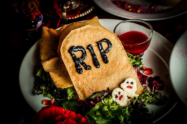 死した野菜を館の住人と呪文を唱える儀式で甦らせる館の名物サラダ。ハロウィンの呪文「闇の墓場に」「生贄の血を」「我らに魔力を」「与え給え」とともに、ベリードレッシングの❝血❞を浴びせた墓場をそっと崩していくと…小さなモンスターたちが次々と現れ、宴を盛り上げてくれます。