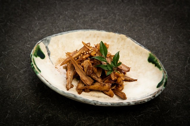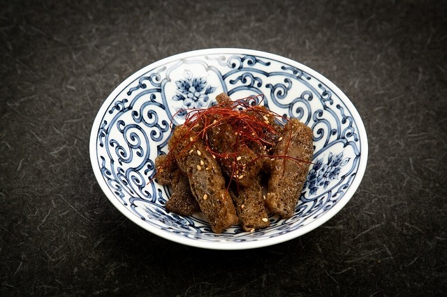 今や世界的人気を誇るヘルシーフード・こんにゃく。凍らせることで水分が抜け、元とはまったく違った、お肉のような食感に変化します。ごま油で甘辛く炒め煮し、お酒にもご飯にもよく合う一皿となっています。