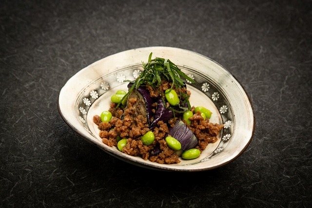 油と相性の良い茄子を素揚げし、濃口醤油をベースに甘辛く炒めた大豆ミートのそぼろと和えました。彩りに鮮やかな黄緑色の枝豆をあしらい、さりげなく❝親子大豆共演❞を果たしています。