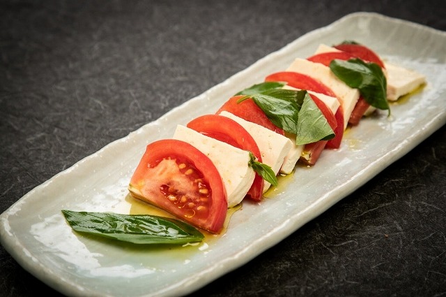 水気を充分に切った木綿豆腐は大豆のふくよかな旨みが凝縮し、チーズにも引けを取らない濃厚さ。フレッシュな酸味と爽やかさを醸し出すトマト&バジルとのトリオで、食欲の口火を切る冷菜です。