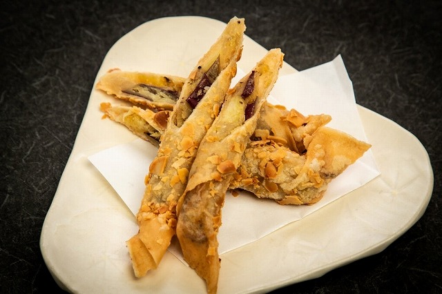 ホクホクした実質と糖度の高さが特徴のさつまいも「なると金時」を餡に、風味豊かなアーモンドを衣にまとわせた甘味系春巻き。香ばしいカリカリ食感と素朴な甘さの絶妙バランスは、おつまみでもデザートでも◎。