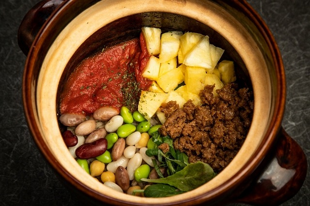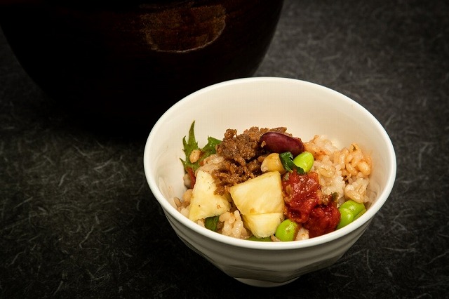 蓋を開けると立ち昇る湯気の向こうに、4種のミックスビーンズ、パイナップル、大豆ミートのそぼろ、ベビーリーフ、トマトソース…と、色鮮やかな具材が現れる、見た目から華やかな羽釜ご飯。個性の違う多種類の具材が不思議と一つにまとまった、和洋折衷の味わいもまた魅力です。