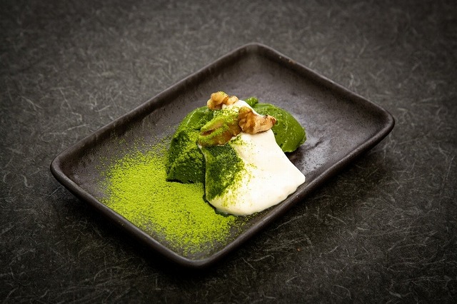 本物の宇治茶を追求する「藤井茶園」の抹茶に豆乳を加え葛で固めたババロアに、豆腐から作ったホイップクリームをたっぷり乗せた和スイーツ。抹茶の濃厚で苦味の効いた風味と大豆のまろやかな甘みがベストマッチ。