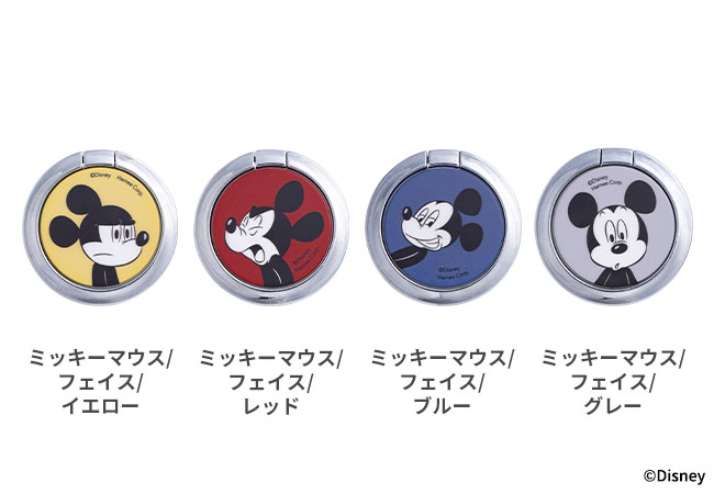スマホリングのデザインは、にやりと笑った顔や、怒り顔などいつもは見られない「ミッキーマウス」の表情がそれぞれ描かれた4柄を展開します。
