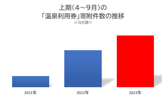 新型コロナウイルス感染症の5類への移行を受けて、“コト消費”(体験型)返礼品の需要が高まっています。それに伴い「温泉利用券」の需要も拡大しています。4月~9月の上半期で、昨年対比約140%、一昨年対比だと約470%と大きく需要を伸ばしている注目の返礼品です(当社寄附受入データより)。