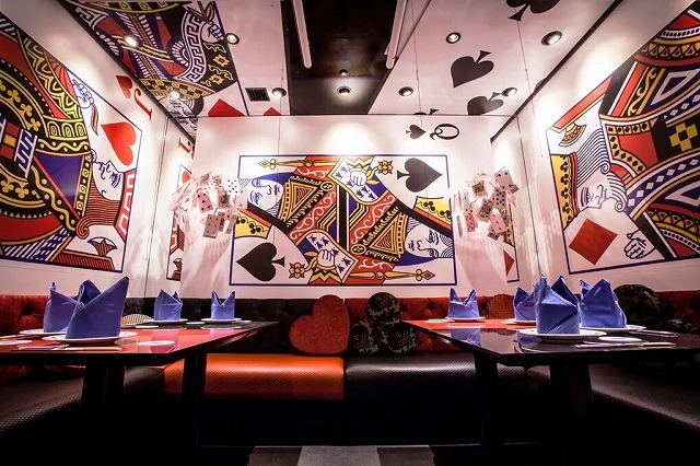 このメインフロアを中心に、大きな大きなトランプに囲まれるソファー席やハートの女王様ご自慢の庭を模したテーブル席など、不思議の国のアリスのパラレルワールドを彷彿とさせる幻想的な空間が広がります。