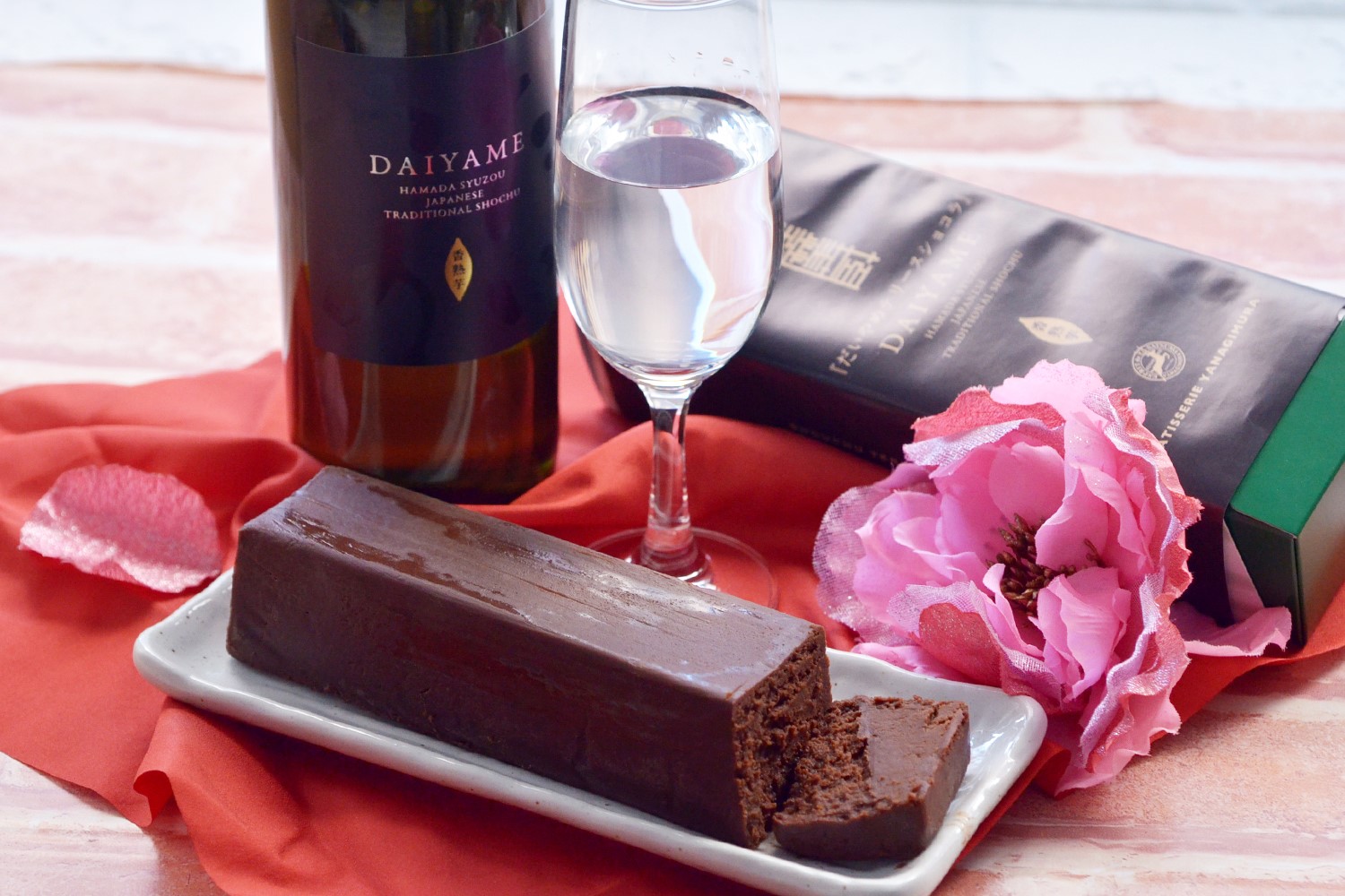 地元鹿児島の魅力をスイーツを通じて発信し続ける「Patisserie Yanagimura」とのコラボレーション。2021年から始まり、今年で4回目を迎えます。生チョコレートのようなねっとりと滑らかな食感と、後に広がるカカオの余韻とライチの香りを堪能できるテリーヌ・ショコラ「DAIYAMEテリーヌショコラ」。その素材となった本格芋焼酎「だいやめ~DAIYMAE~」720mlとセットにしました。これまで、芋焼酎だいやめ好きな方が、大切な方へのプレゼントや自分へのご褒美に2セットを購入される方もいらっしゃいました。今年も、オンラインショップ「Shochu.Life」にて、30個限定にて発売いたします。
