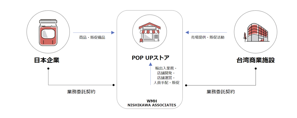 台湾の商業施設では現在、日本ブランドへのニーズが高まっています。そこで、WMHとNISHIKAWA ASSOCIATESは、日本企業が単体で商業施設に展開する支援に加え、複数の企業が合同で販売を行えるポップアップストアや催事を行っていきます。物流会社と連携しながら輸出入代行もサポートするため、商品の受け渡しと代金のやり取りは日本で行うことができます。