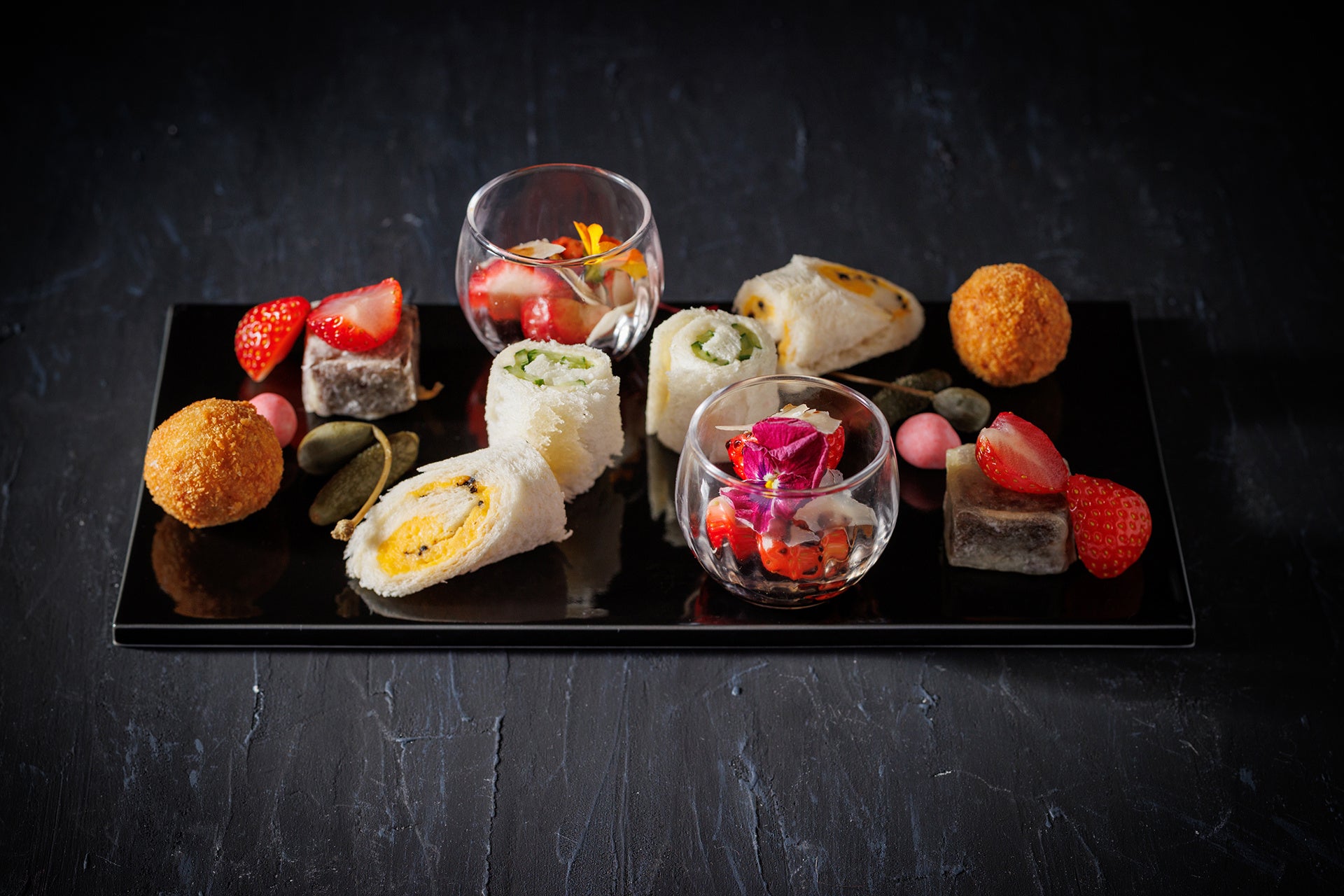 ティースタンドのお皿は創業130年の歴史をもつ有田焼ブランド「深川製磁」にてオーダーメイドし、ホテルブランド「ICONIC」のカラーであるリッチブラックに仕上げました。「深川製磁」はホテルから徒歩約1分の場所に店舗を構え、バー・ラウンジ「THE BAR」には陶磁器を展示しています。