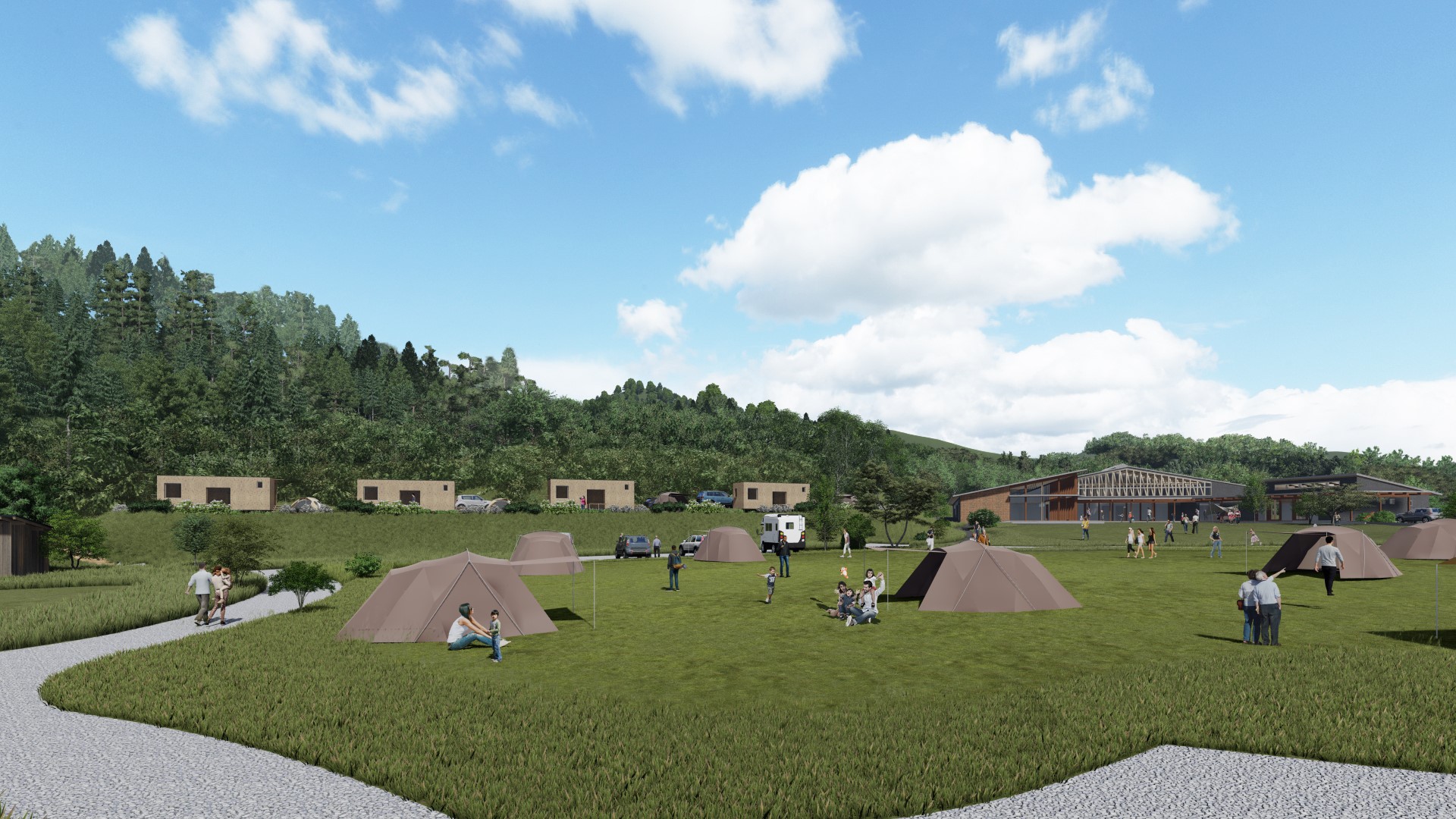 今回、開業するキャンプフィールドには全部で91サイトあり、フリーサイトから電源サイト、そして隈研吾氏と共同開発したモバイルハウス『住箱-JYUBAKO-』まで、様々なニーズやキャンプスタイルに対応できるようになっています。またキャンプに必要な道具一式をレンタルでき、手ぶらでキャンプが楽しめる「手ぶらCAMPプラン」もあります。また本キャンプフィールドには、露天風呂やサウナなどを備えた温浴施設も併設します。施設内の飲食施設は地元組織が運営し、地域と連携してまちを盛り上げていきます。
