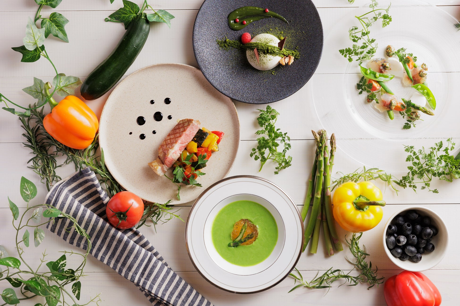 華やかなオードブルから始まり、濃厚なアスパラガスの冷静スープ、爽やかなオレンジ香るオマールエビのグリルなど、初夏らしいメニューをご堪能ください。