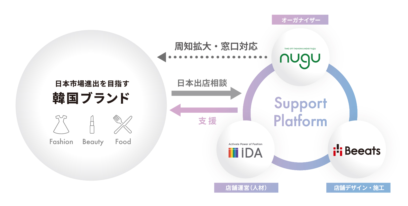 先駆者として成功のノウハウを有するnugu運営のCREATE、顧客体験の場の創出に精通したビーツ、そして人材サービスや店舗運営に精通するiDAの提携により構築される「日本進出支援プラットフォーム」を通じて、nuguをはじめとする韓国ブランドの日本進出における課題を解決し、店舗設計・施工・マーケティングから運営までにいたるトータルサポートを提供します。