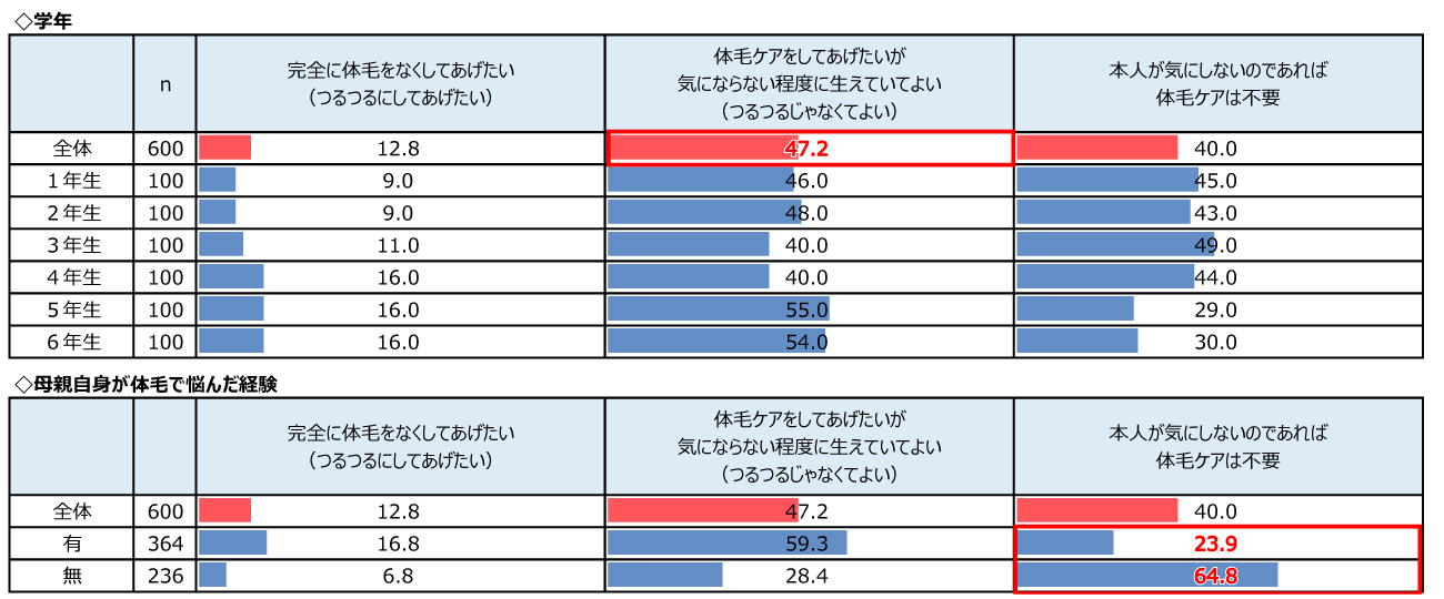 小学生女児の母親600名へお子さまの体毛事情のアンケート調査 小学4年生で「お手入れしている」または「気になっている」が半数超え
