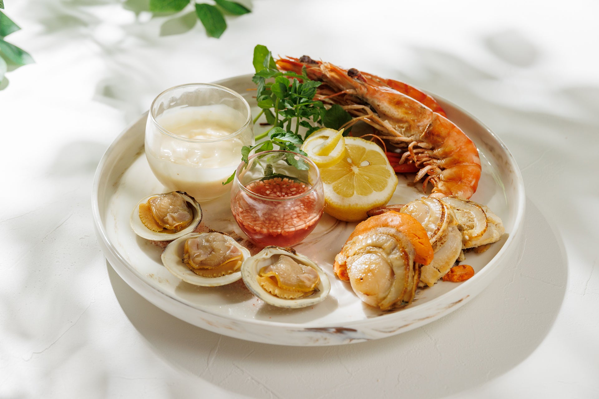 フランス料理の定番、冷製の魚介の盛合せを、温製に仕立てました。辛口の白ワインにぴったりの1皿です。