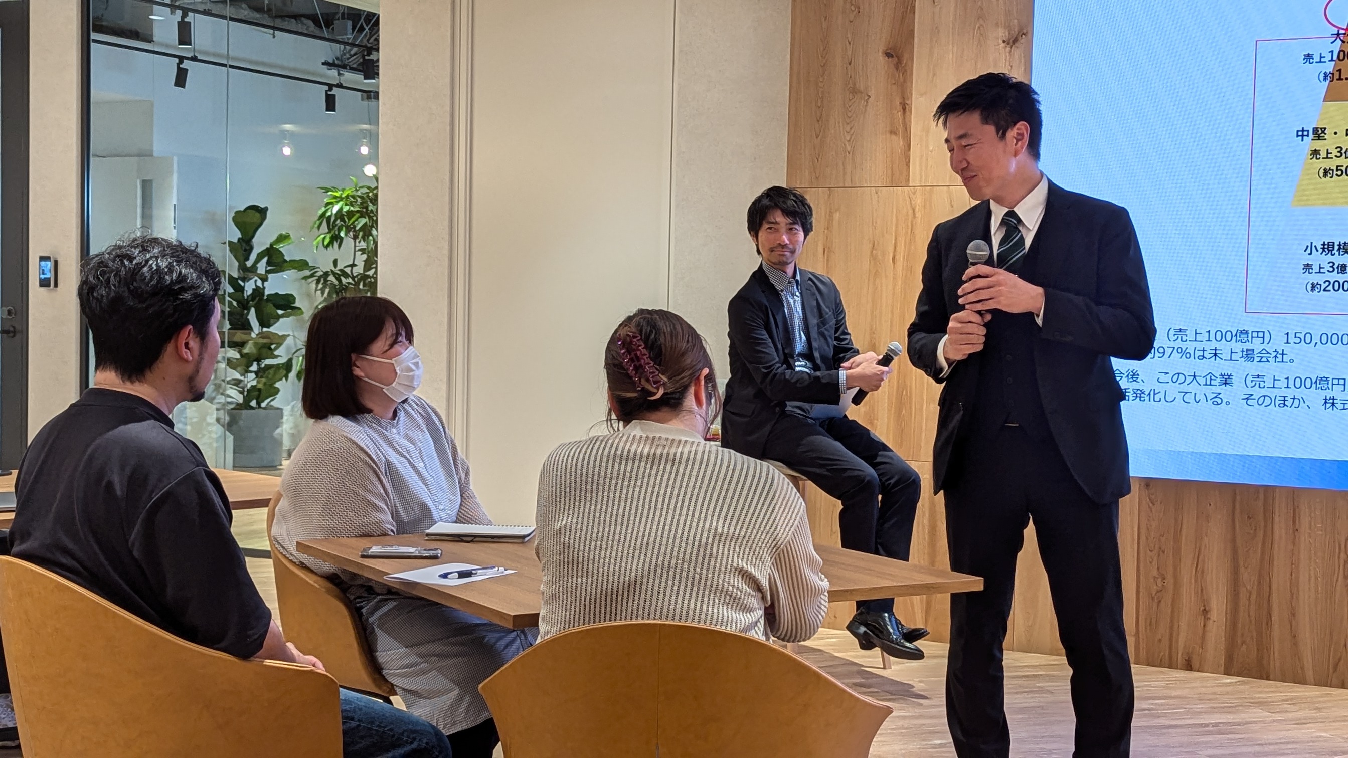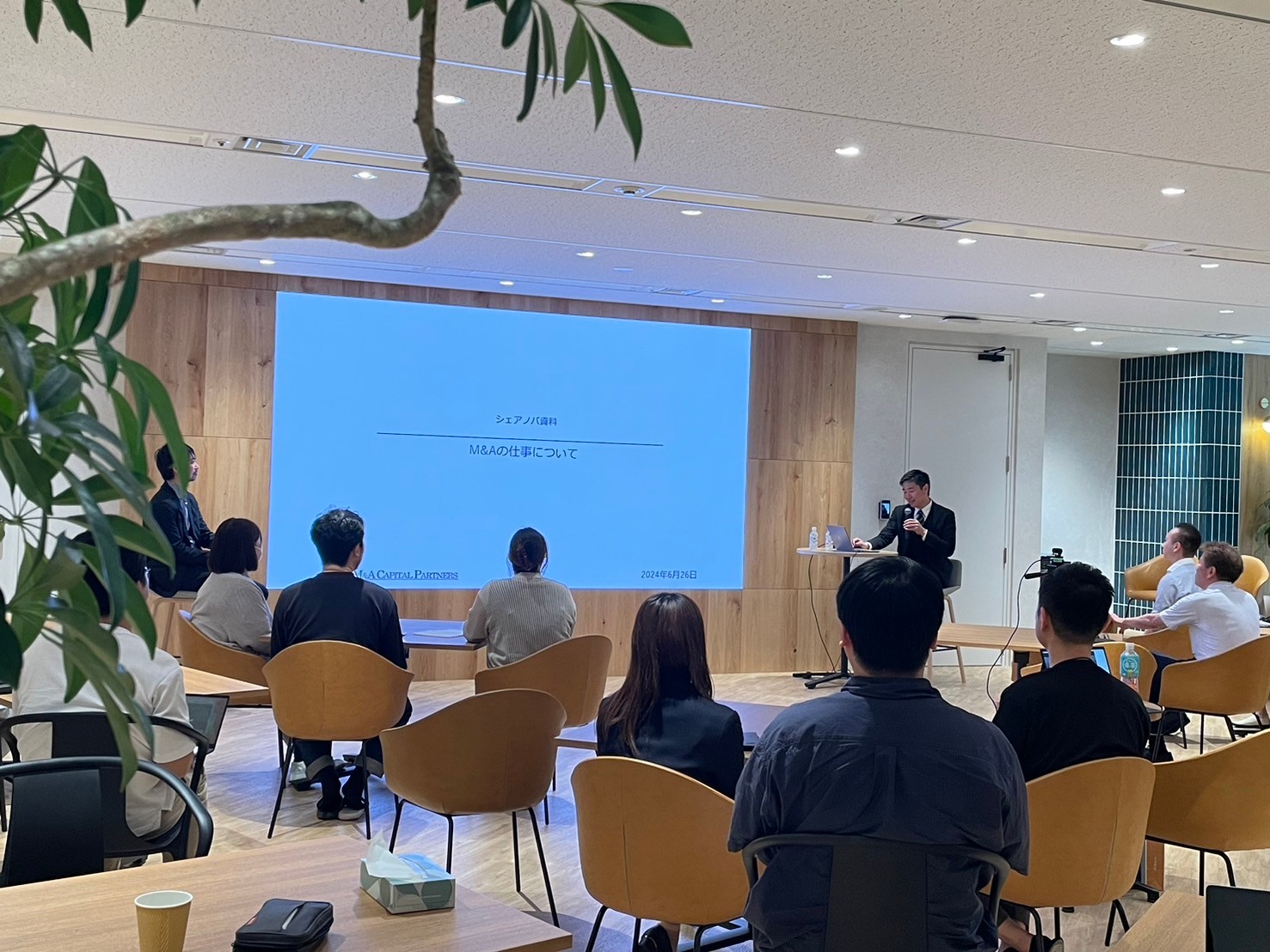 6月26日(水)に第41回シェアノバが開催されました。M&Aキャピタルパートナーズ株式会社 執行役員前川勇慈 氏にご講演いただきました。前川氏は「M&Aから見える今後の日本社会」をテーマに、今後の日本にM&Aが不可欠な理由についてお話されました。社員からは、日本の社会構造が抱える課題について、多くの学びが得られたと好評でした。
