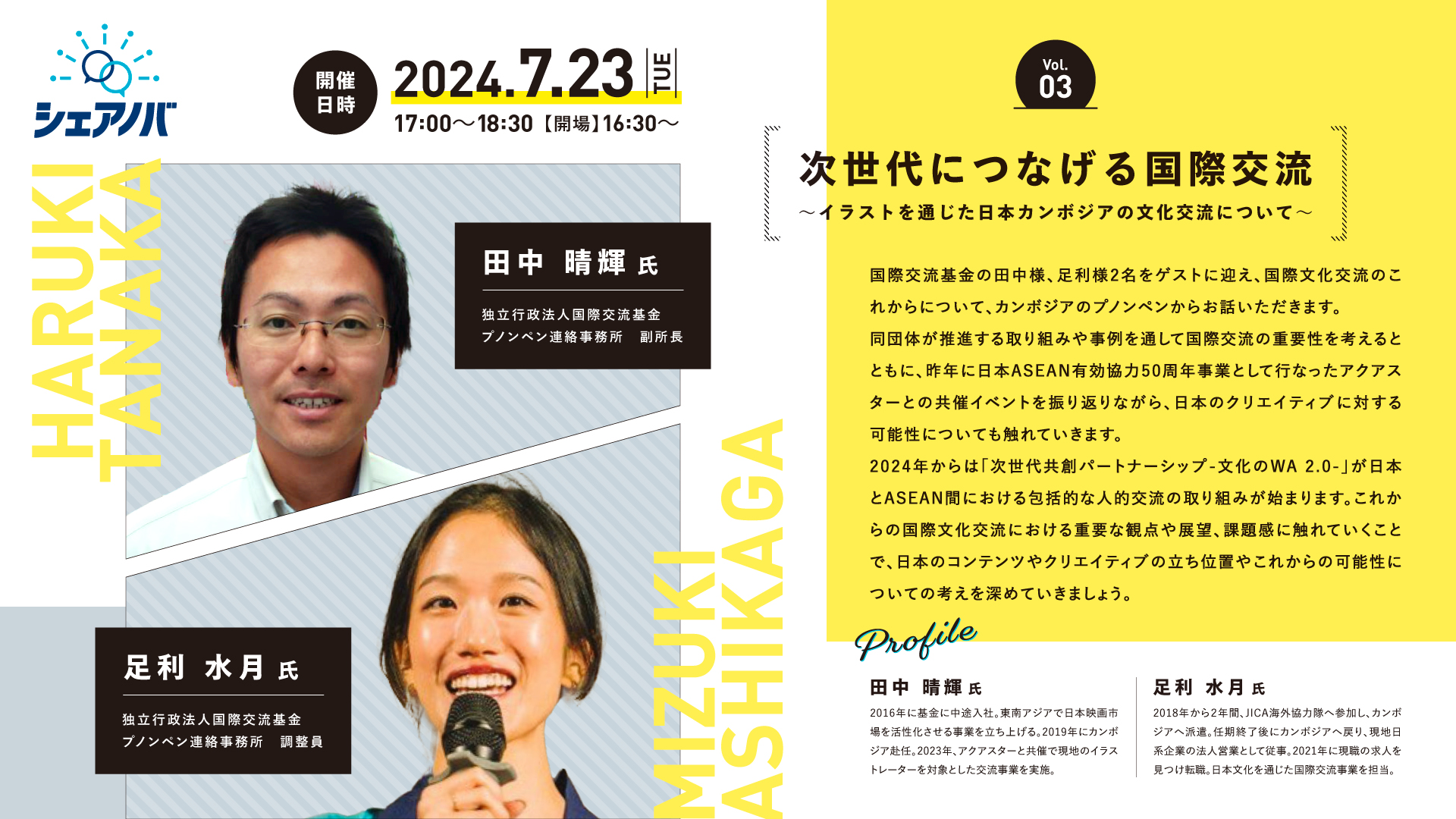 今回のシェアノバでは、こうした取り組みを背景に、次世代につなげる国際交流の可能性や課題についてゲストよりお話していただき、イラストを通じた日本とカンボジアの文化交流の意義を深掘りします。参加する社員においては、文化交流の新たな形について考える機会となることを期待しております。また、社員が得た知見やインスピレーションを今後のプロジェクトや業務に活かし、企業が国際的な展開やクリエイティブ活動のきっかけづくりとなることを目指しています。