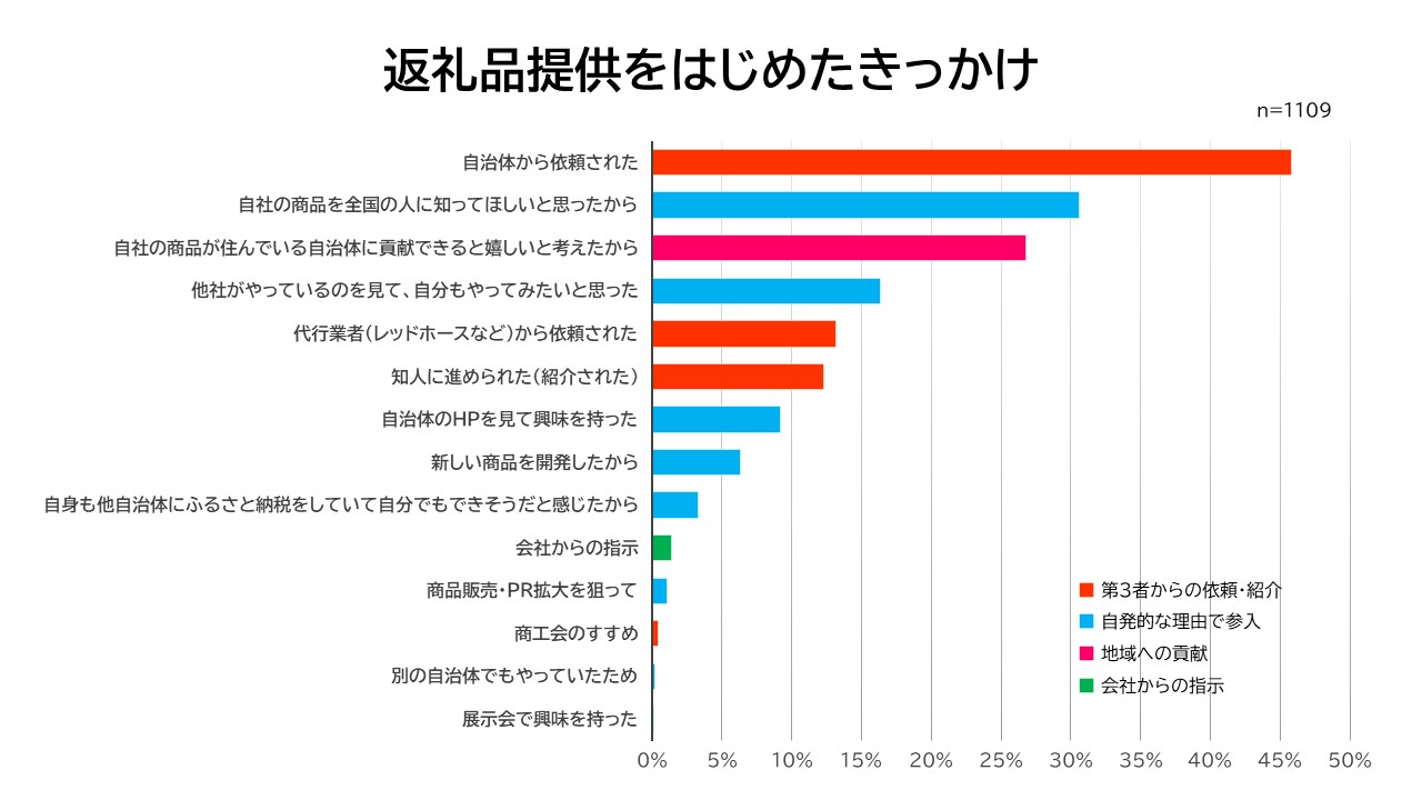 全国のふるさと納税返礼品提供事業者に、ふるさと納税に返礼品提供を始めたきっかけを聞いたところ(複数回答可)、「自治体からの依頼」(46%)や「代行業者からの依頼」(13%)、「知人からの紹介」(12%)や「商工会のすすめ」(1%)など、第3者からの依頼や紹介での参入が最も多い回答でした。