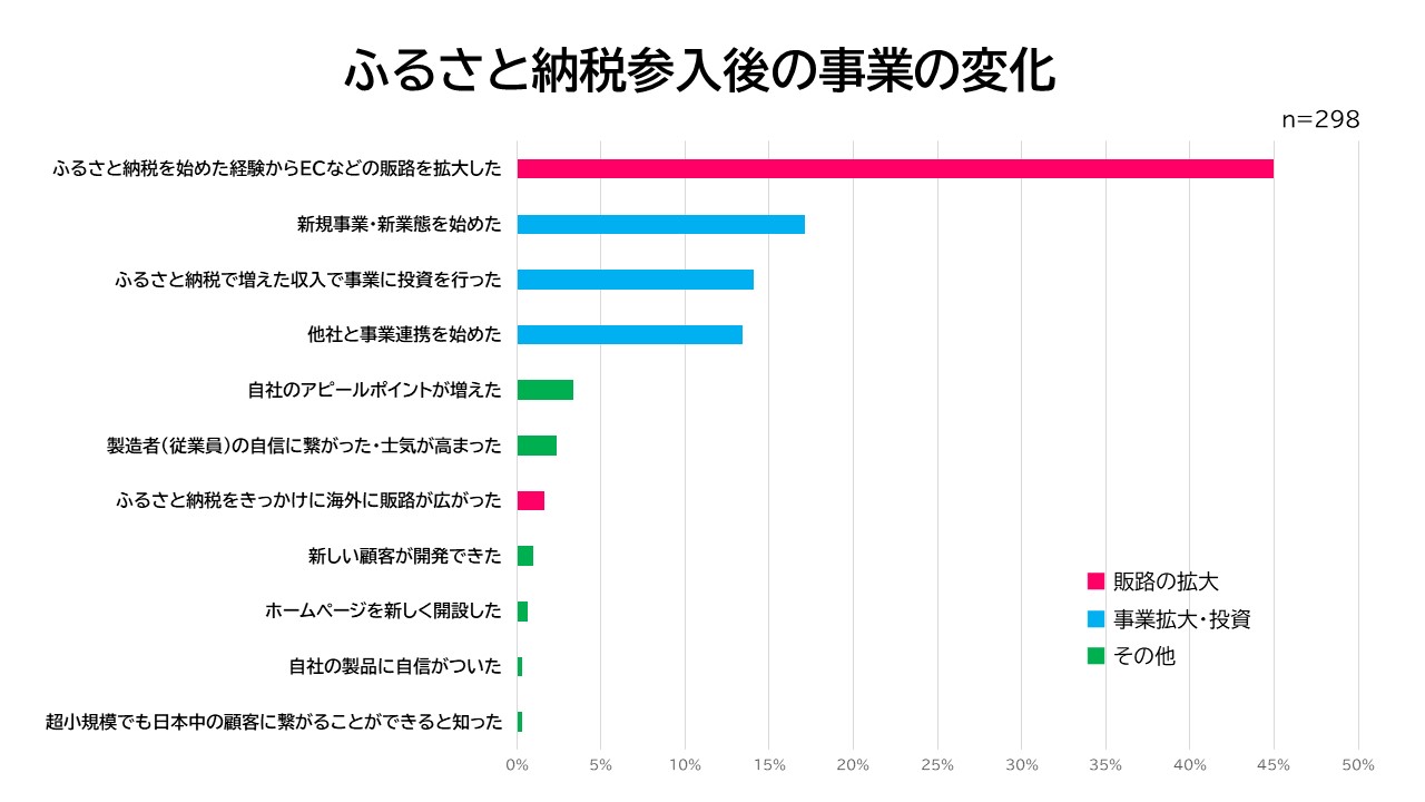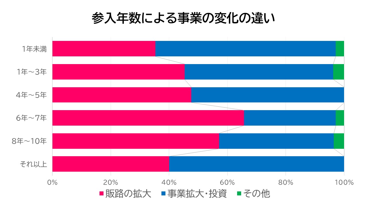 また、参入6年~7年の事業者がECなどの販路拡大に取り組みによる事業の変化を実感していることもわかりました。ふるさと納税の経験を生かした国内外への販路拡大がなされているようです。