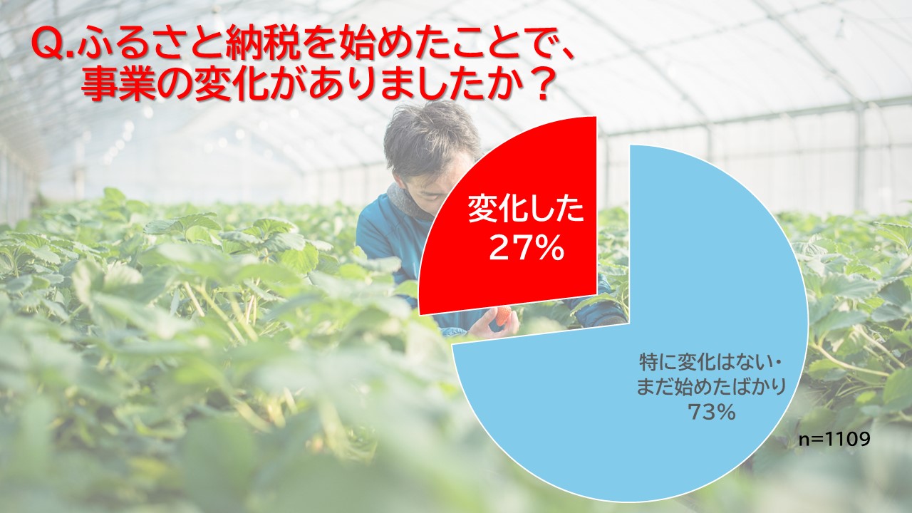 ふるさと納税に返礼品を提供したことによって起こった事業への変化についての問いには、全回答者1,109の73%が「特に変化はない」と答えました。