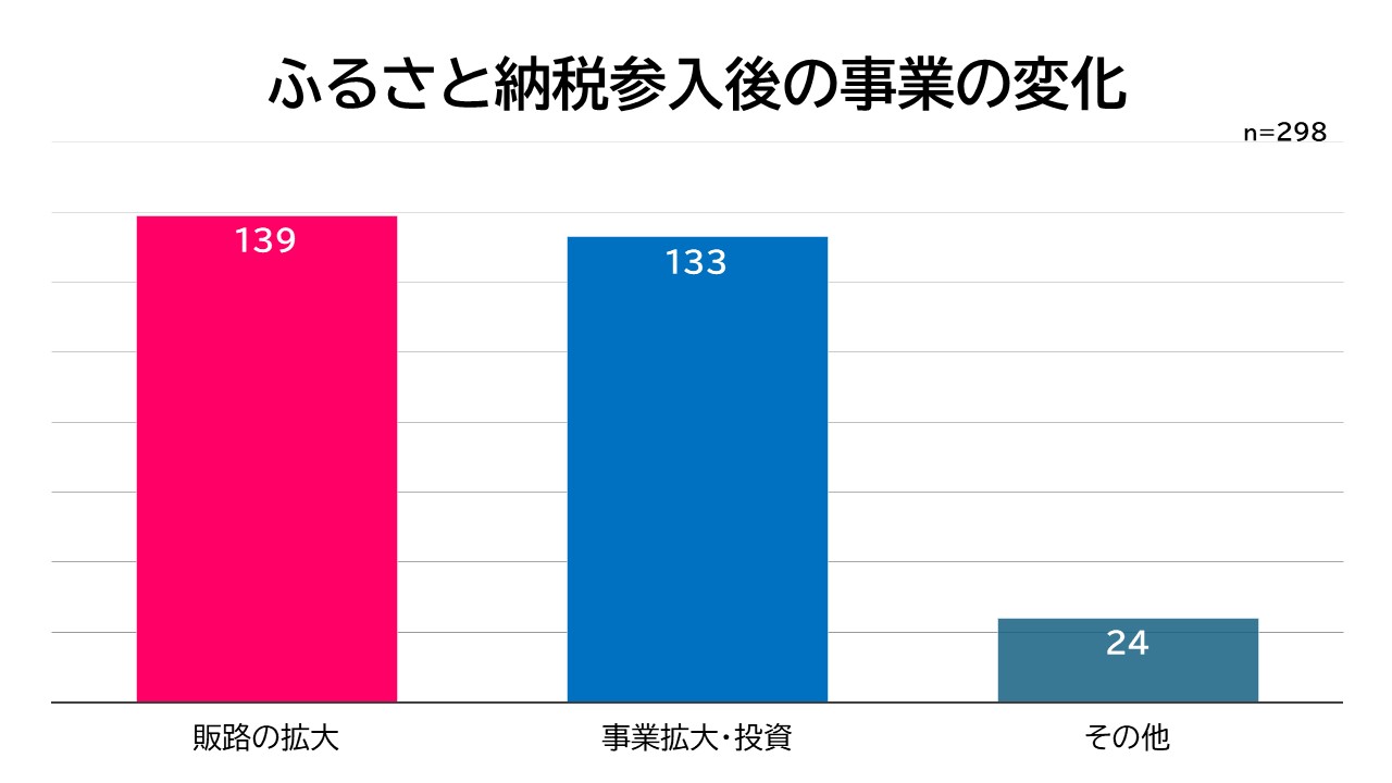 一方、「変化があった」と回答した298の事業者に対し、具体的な変化について確認したところ(複数回答可)、「ふるさと納税を始めた経験からECなどの販路を拡大した」(45%)「ふるさと納税をきっかけに海外に販路が広がった」(2%)など、販路拡大を挙げた事業者が139と最も多い結果となりました。ふるさと納税を1つのテストマーケティングの場として活用し、国内だけでなく海外にも販路を広げている事業者が多く見られました。