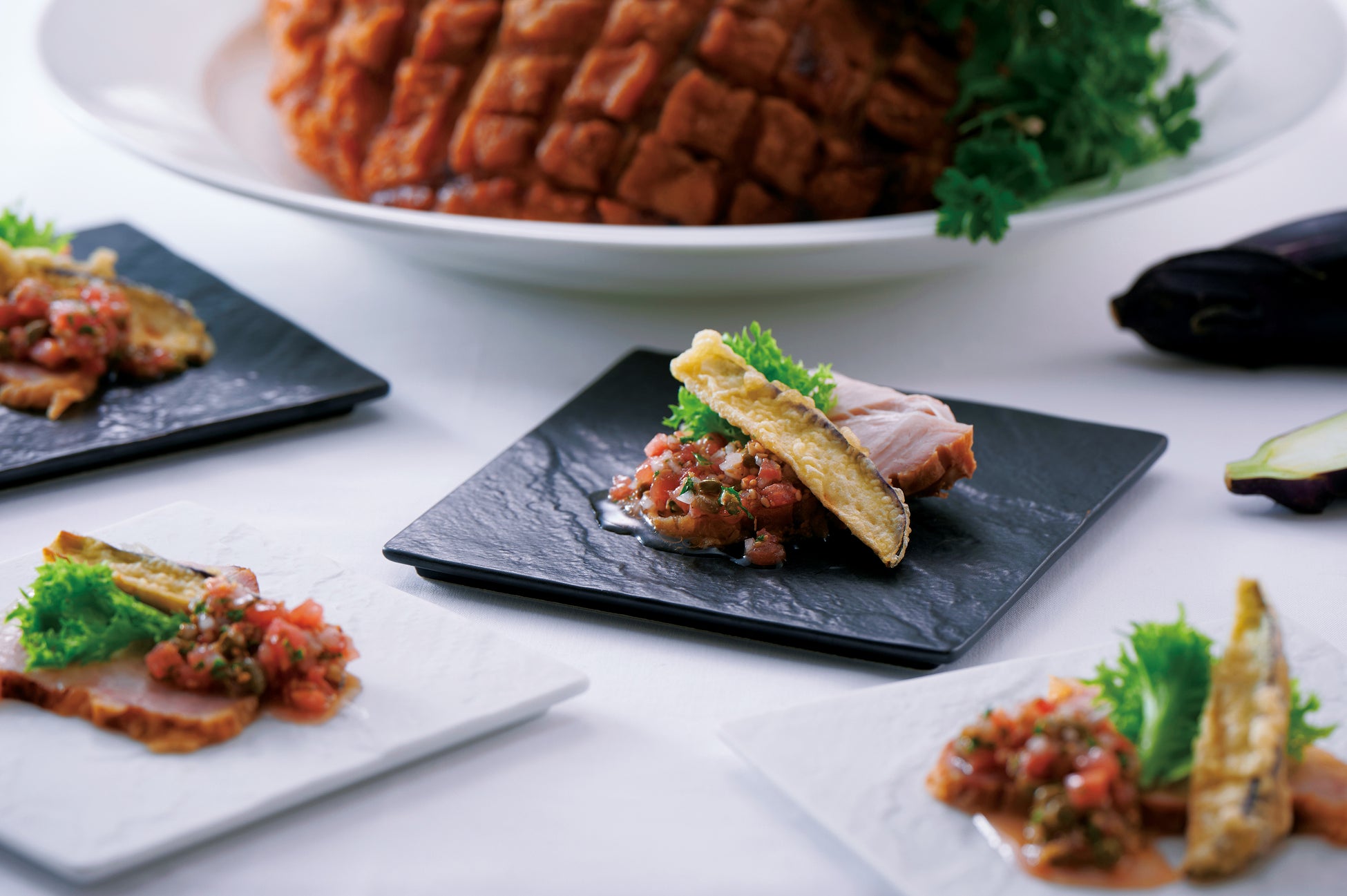 ・やまゆりポークもも肉のロースト 茄子の天ぷら添え ラビゴットソース