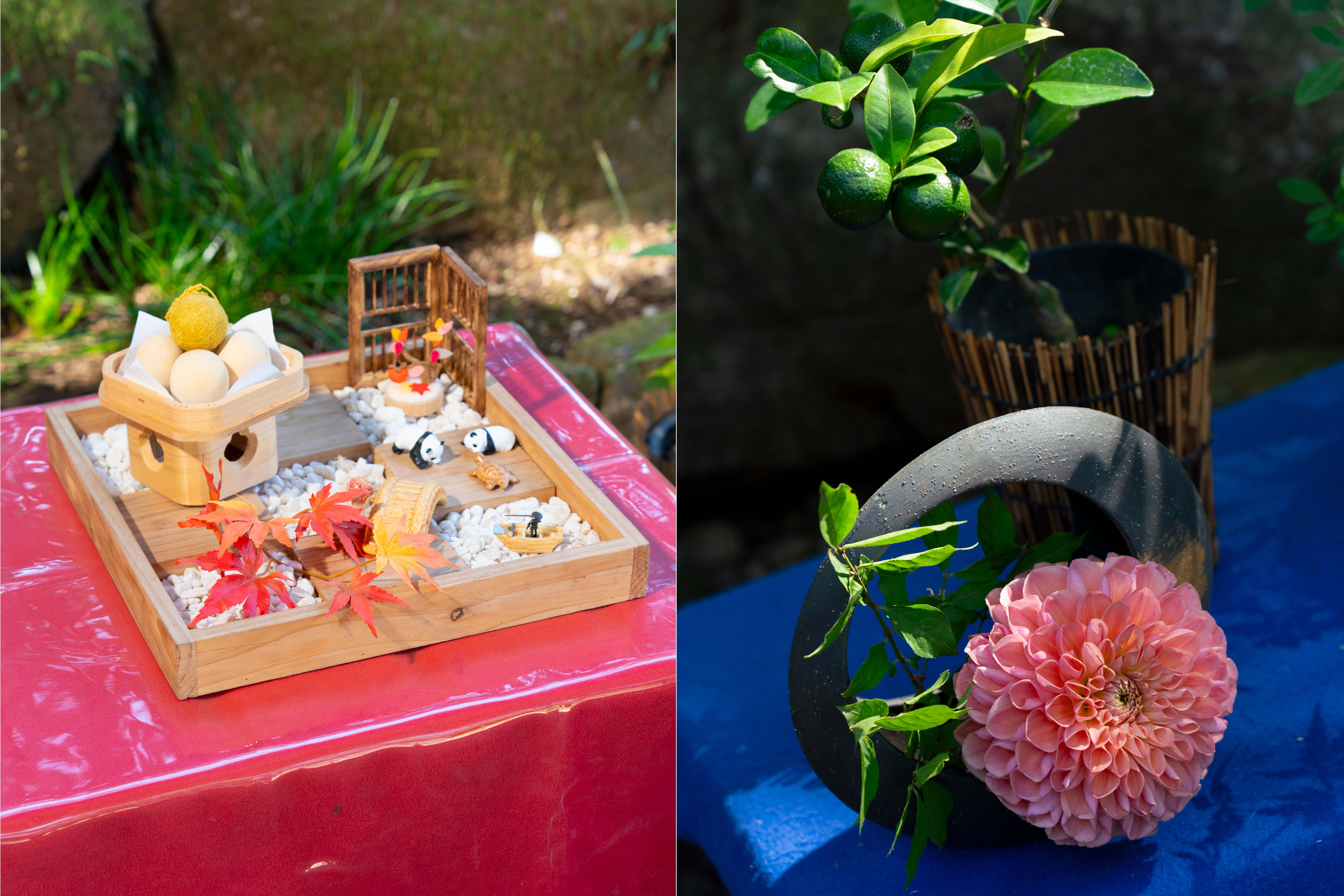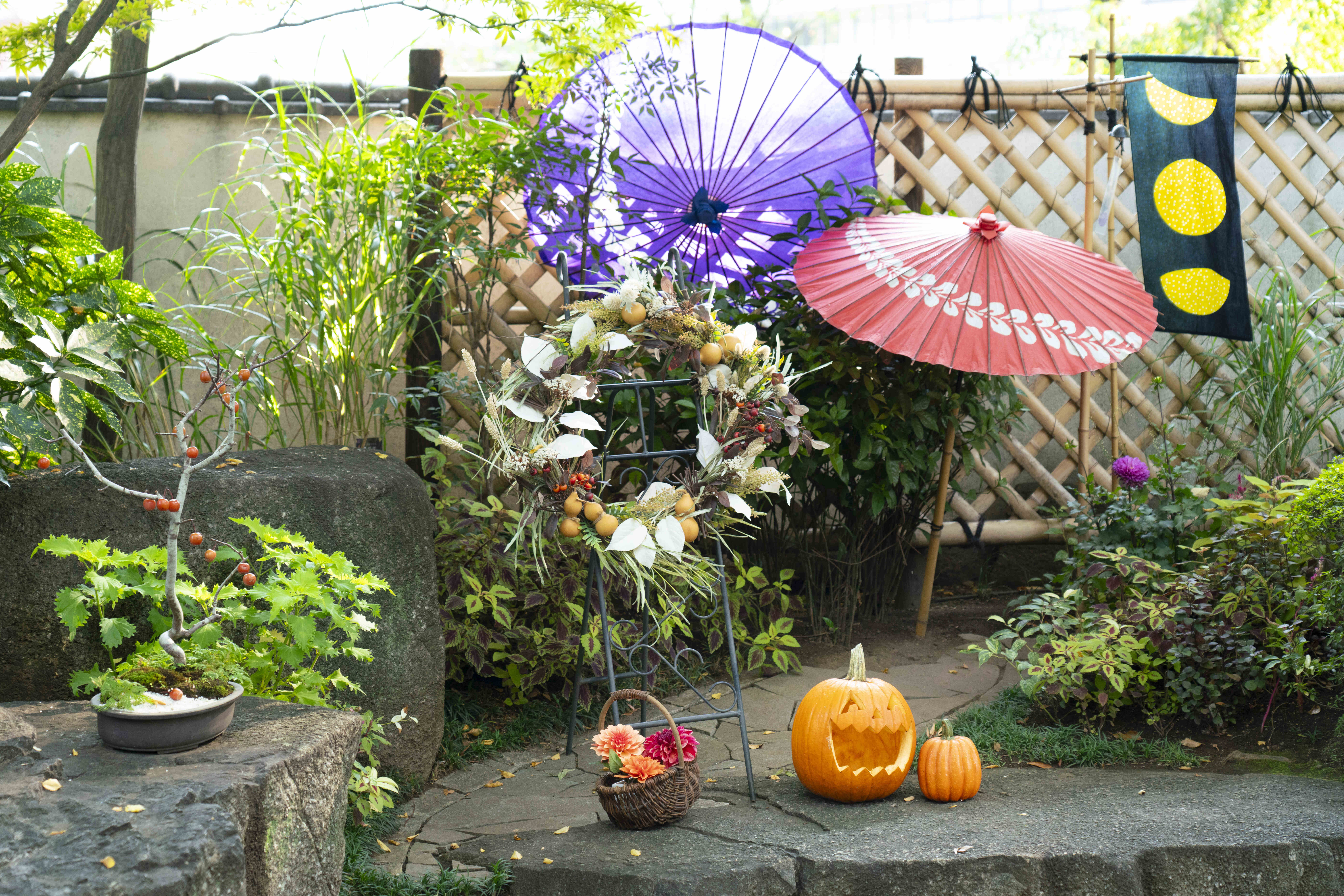 ダリア等の花々と一緒に、お月見やハロウィンなど季節に合わせた展示や寄せ植え、盆栽などをご用意しています。