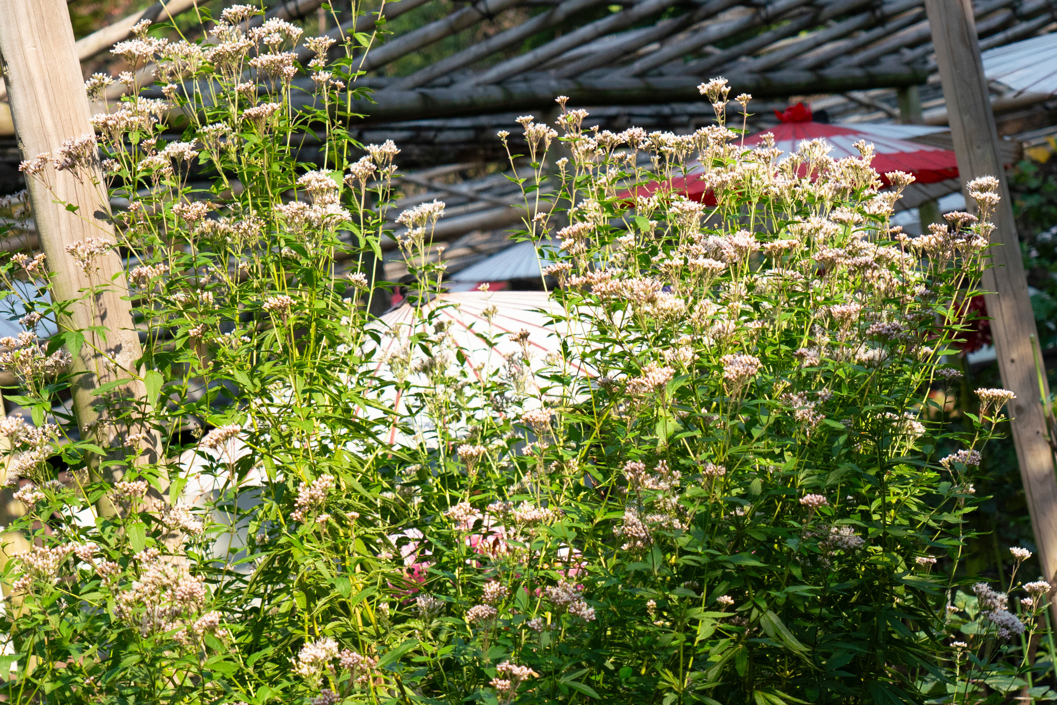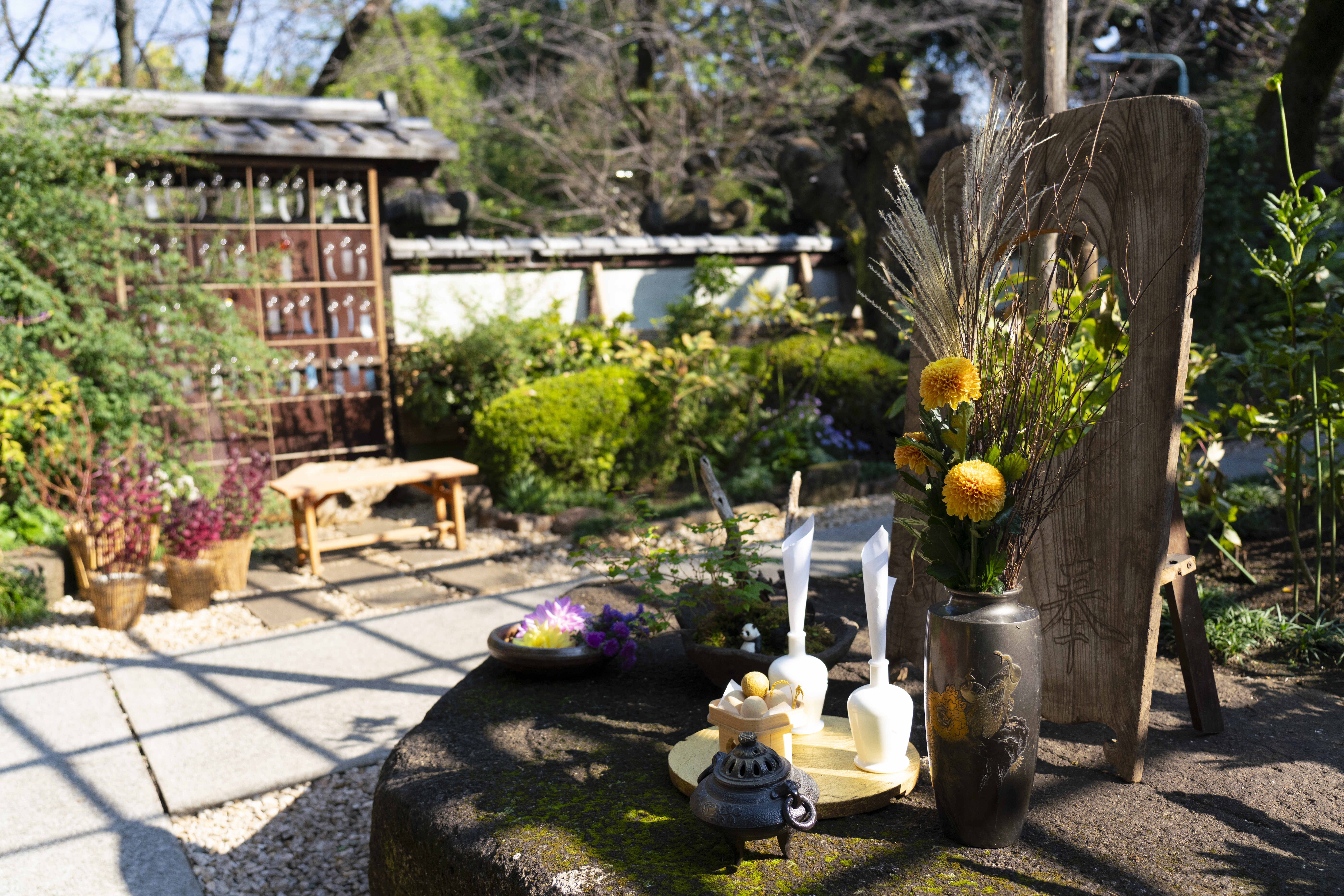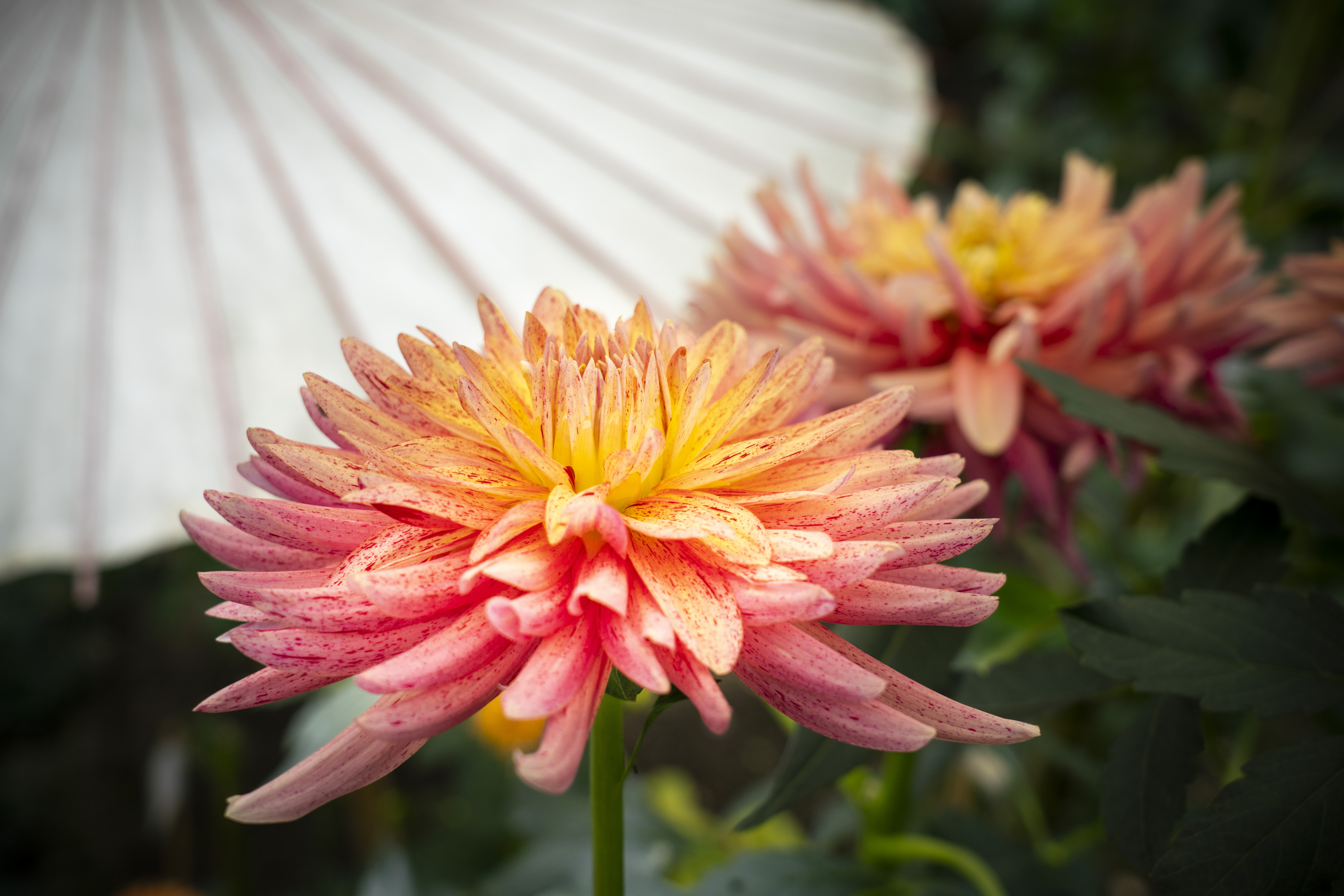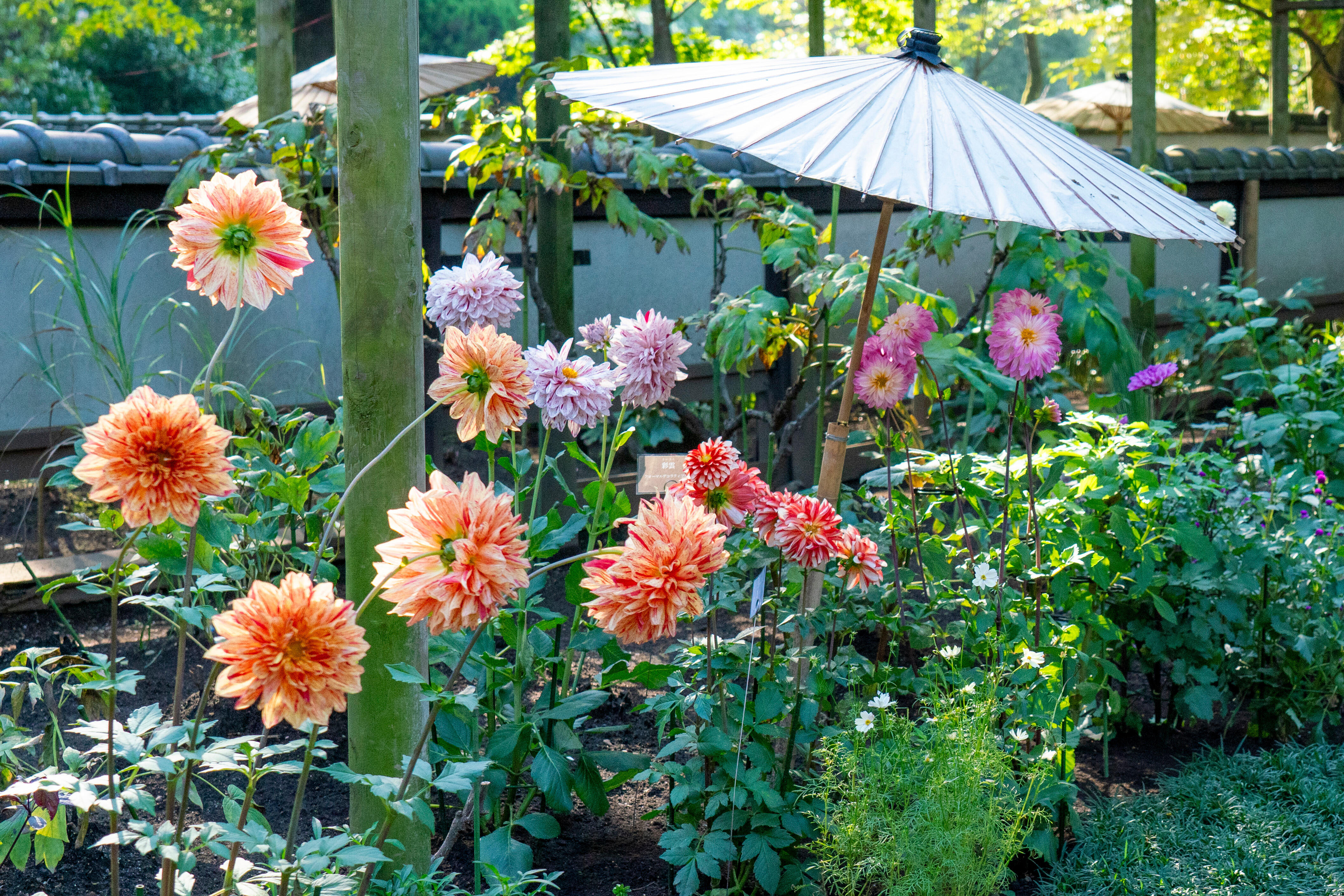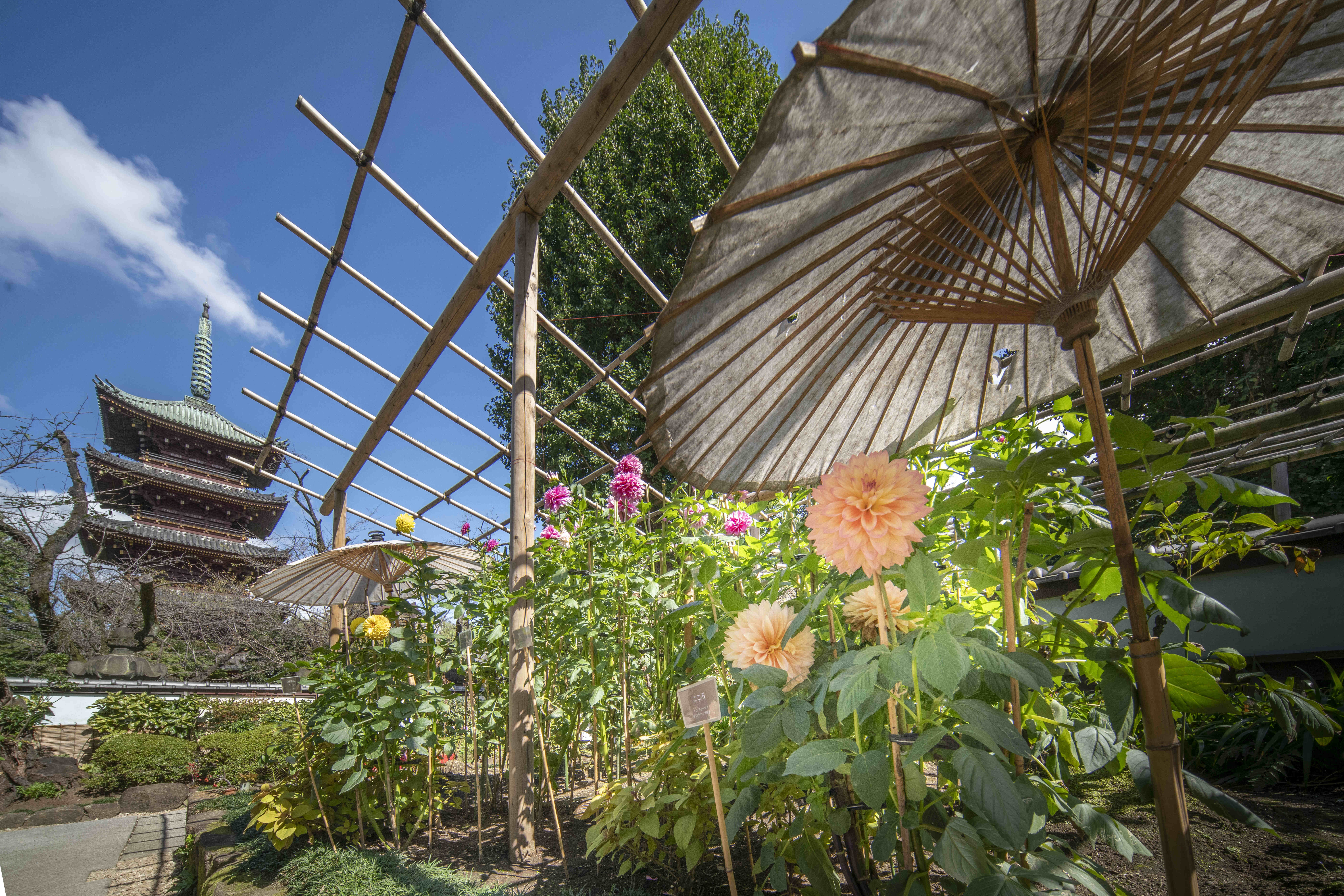 苑内では旧寛永寺五重塔や東照宮の参道に並ぶ石灯籠とあわせた江戸風情の中、和傘を庇にして咲くダリアを楽しめます。