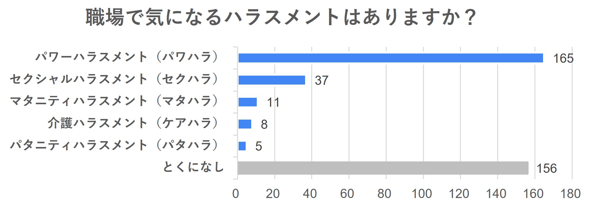 職場で気になるハラスメントに対しては「とくになし」に156件の回答があった一方で、「パワーハラスメント」が165件と最も多い結果となり、ファッション・ビューティー業界の労働環境においても、不当な扱いなどを感じるケースが発生していることが見受けられます。