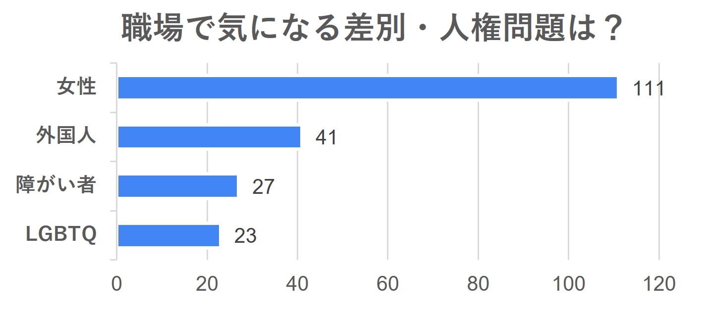 気になる差別・人権問題については「女性差別」が111件と最も多く、その内容として業務や待遇について差別を感じるという回答が最も多い結果となりました。また「外国人差別」「障がい者差別」「LGBTQ差別」に対しても、各々の項目において、差別的な対応があったという回答がありました。