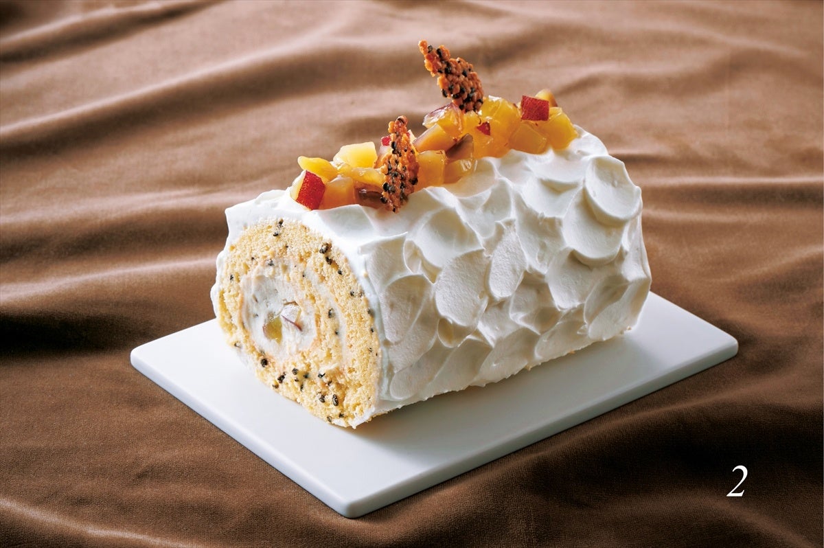 黒ごまを混ぜ込んだロール生地に、さつまいものペーストを加えたホテルオリジナルクリームとさつまいものシロップ煮を巻いたロールケーキです。