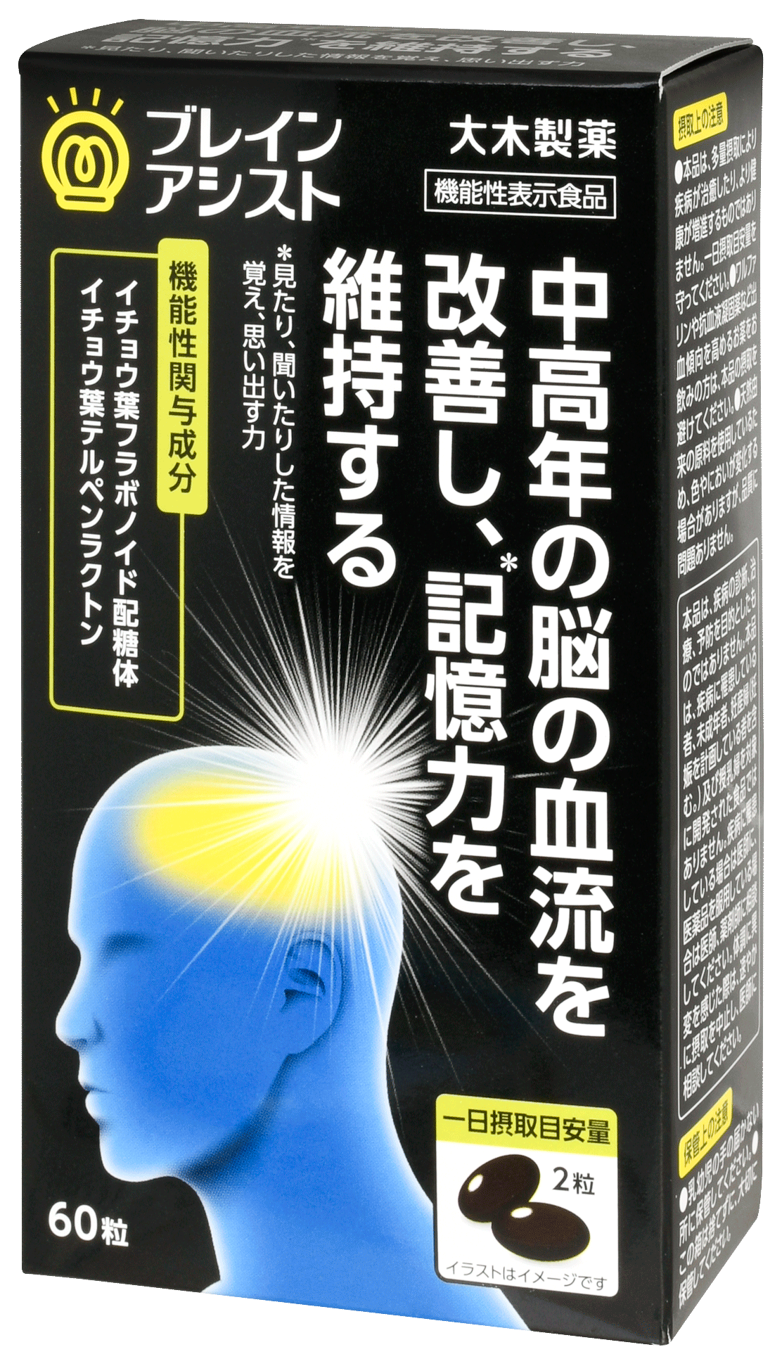 ブレインアシスト イチョウ葉エキスαは、機能性関与成分イチョウ葉フラボノイド配糖体、イチョウ葉テルペンラクトンを配合した機能性表示食品です。
